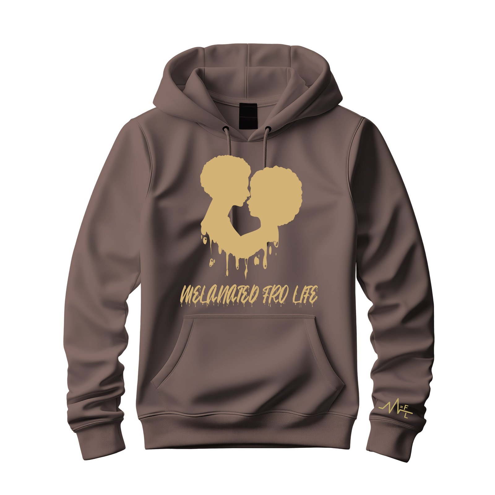 Celebrate culture, love, and pride with the “Melanated Fro Life” Hoodie. This sleek brown savana hoodie features a bold tan silhouette of two individuals with iconic afro hairstyles, forming a heart to symbolize unity and self-love. The dripping effect adds a modern, artistic touch, while the phrase “Melanated Fro Life” proudly represents the beauty and strength of natural hair and melanin.